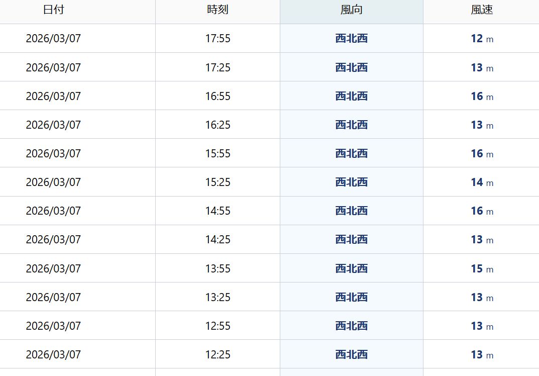 ★(2026年3月7日更新)《TSUKASA HAMANAKO、風速15m/sオーバーの超極上コンディション下で全プレーニングクラス終了(今日の風速)