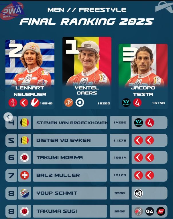 2025World Tour J171-TakumiMoriya ![]() ☆2025PWAワールドツアーランキング6位(FREESTYLE)PWA ☆2025FPTツアーランキング4位(FREESTYLE)FPT ---------------------------------------------------------------------------------- 7☆FreestyleProTour NAXOS Greese(10/17〜10/21) Pro MENS=2th place(TOW-IN) ---------------------------------------------------------------------------------- 7★PWA Sylt, Germany Grand Slam(9/25〜10/5) PRO MENS=9th ---------------------------------------------------------------------------------- 6★PWA Fuerteventura GrandSlam,FREESTYLE(7/23日〜7/27) ☆シングルイルムネーション=PWA日本人初《表彰台》3位 ☆ダブルイルミネーション=PWA日本人過去最高順位4位獲得 (同順=杉プロ 2023フイジー4位) 《PWA-news》から ☆PWA FREESTYLE=《過去最高順位》 《PWA撮影画像》 シングルイルミネーション《 PWA-FREESTYLE ハイライトDAY1表彰台動画》 Men's Single Elimination Small Final-Takumi Moriya v Jacopo Testa 3位になったヒート全8分! 残り2分の大逆転!PWA動画》 ------------------------------------------------------------------------------------- 6☆FreestyleProTour Paros(6/29〜7/2) Pro MENS=4th place 《ダブルヒート表》1位=Lennart・2位=Yantel・3位=Jacopo・4位=Takumi 《Day 2 Highlights》 -------------------------------------------------------------------------------------- ---------------------------------------------------------------------------------- 《WAVE》 ★PWA Gran Canaria Gloria WorldCup WAVE(7/5〜7/13) U21Boy,s=5th place 《ダブルヒート表》/《画像》/PWA-news《最終順位》 《Day7Highlights》 ---------------------------------------------------------------- |